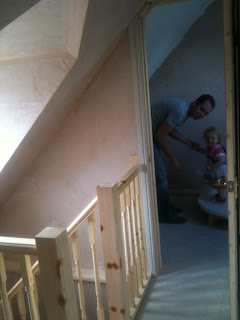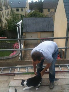While Andrew was prepping and painting in the loft, Charlie was spotted on the scaffolding! He had climbed out of the loft window, slid down the slates and become trapped. Silly boy.