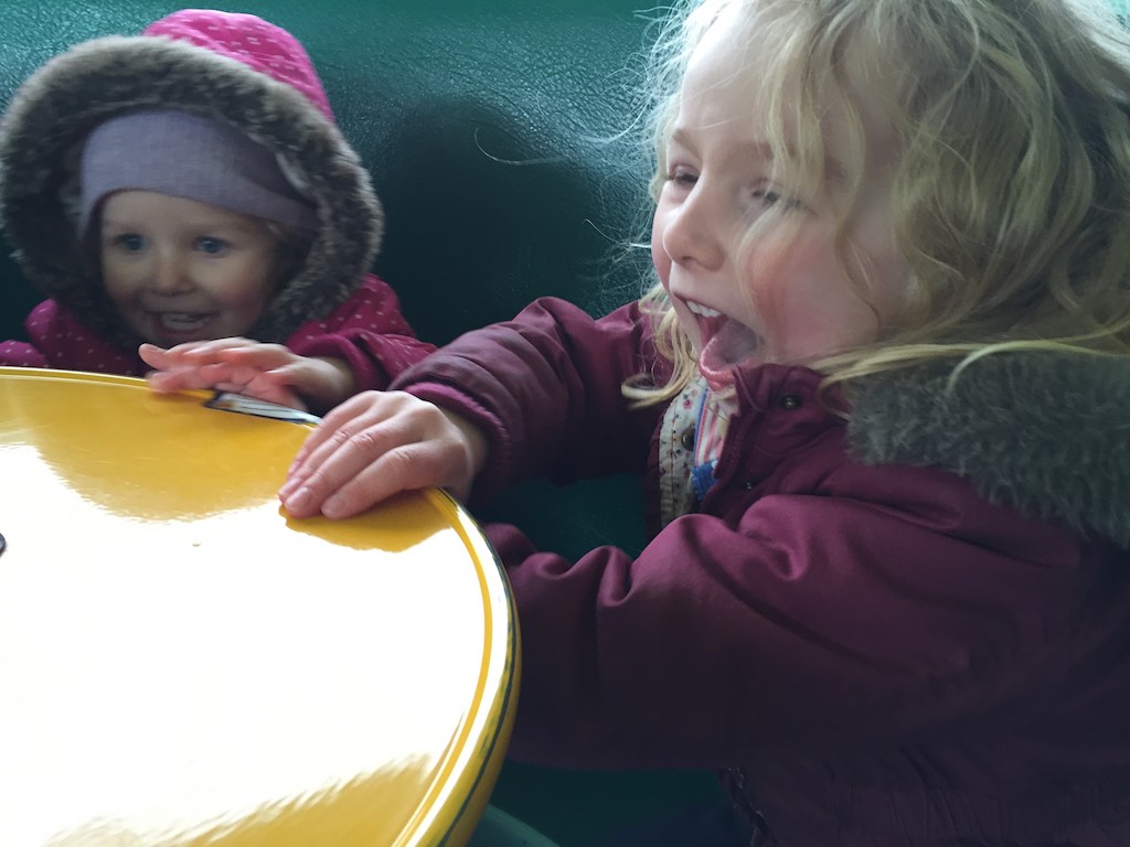 The next day, we went back to Peppa Pig World after a delicious breakfast (waffles!) and a swim. Evie decided she'd like to go back to ride on a dinosaur again while Isla went off with Andrew to do the big rides, including the Cobra rollercoaster.